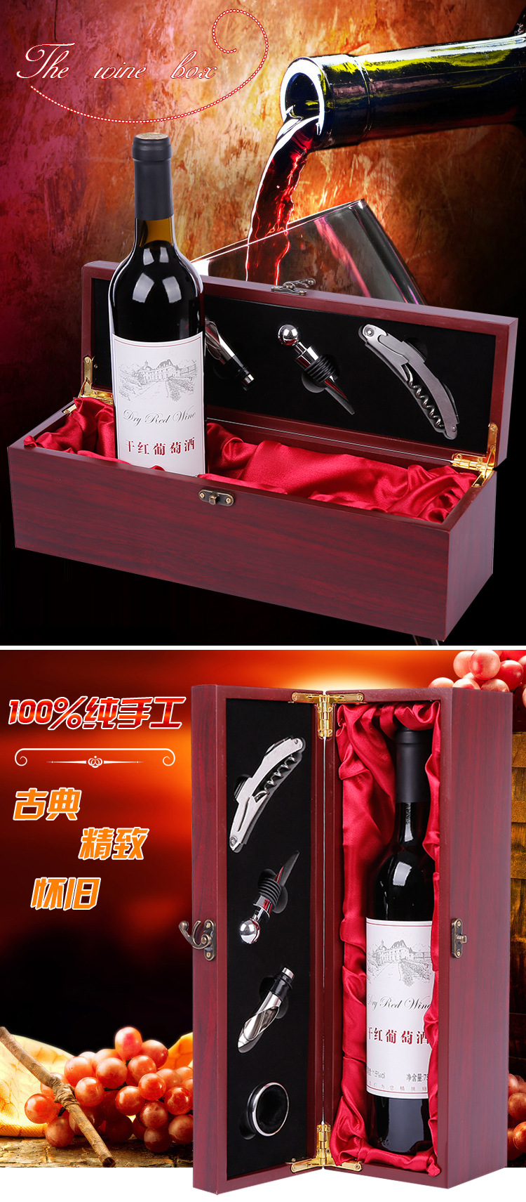 高档红酒盒单支木盒子葡萄酒盒礼盒拉菲盒酒具套装四件套